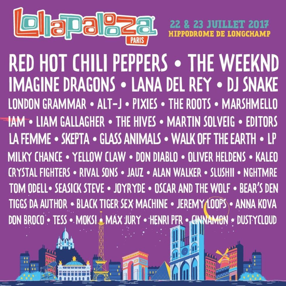 Headliners for the inaugural Lolla Paris include Red Hot Chili Peppers, The Weeknd, Imagine Dragons, Lana Del Rey and DJ Snake. The bill also features The Roots, alt-J, Pixies, Liam Gallagher, The Hives, Glass Animals, Skepta and many more. The two-day event will feature over 40 acts appearing across four stages.