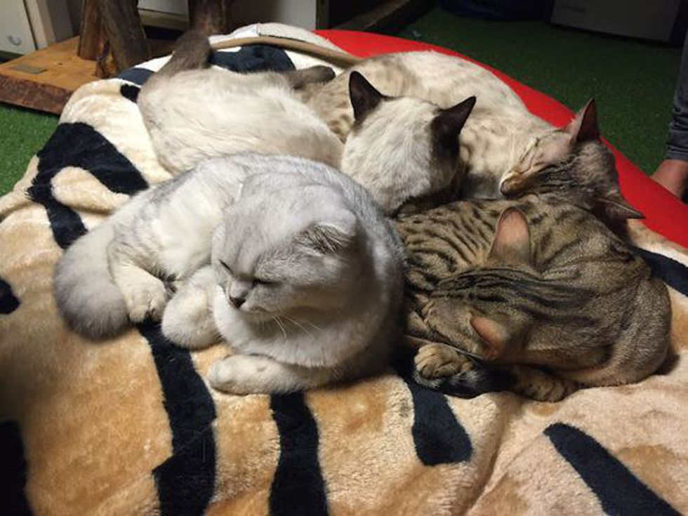 Nunu is a chinchilla Persian breed of cat that came out grey instead of white like Snow and Misty, these cats aren't your average pussies. Freddy, an orange tabby cat sized larger than most small dogs, is the orange tabby cat - otherwise known as Head Puss In Boots Charge. Snow and Ollie can be seen front and center below.