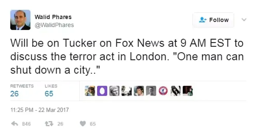 Here's the reality: London was not shut down. Of course one must consider the semantics of this sentence, but to claim that one man has shaken an entire city is baseless and disgusting to Londoners. I am glad they responded verbally and visually to prove Phares wrong. Many shot back at Phares including Tom Chivers who tweeted, "The "London is shut down, city in fear" the narrative is immensely insulting to Londoners, who have seen a lot worse. London is very safe now." To immediately insinuate that everyone is in fear only fuels these terrorists. It's what they want.