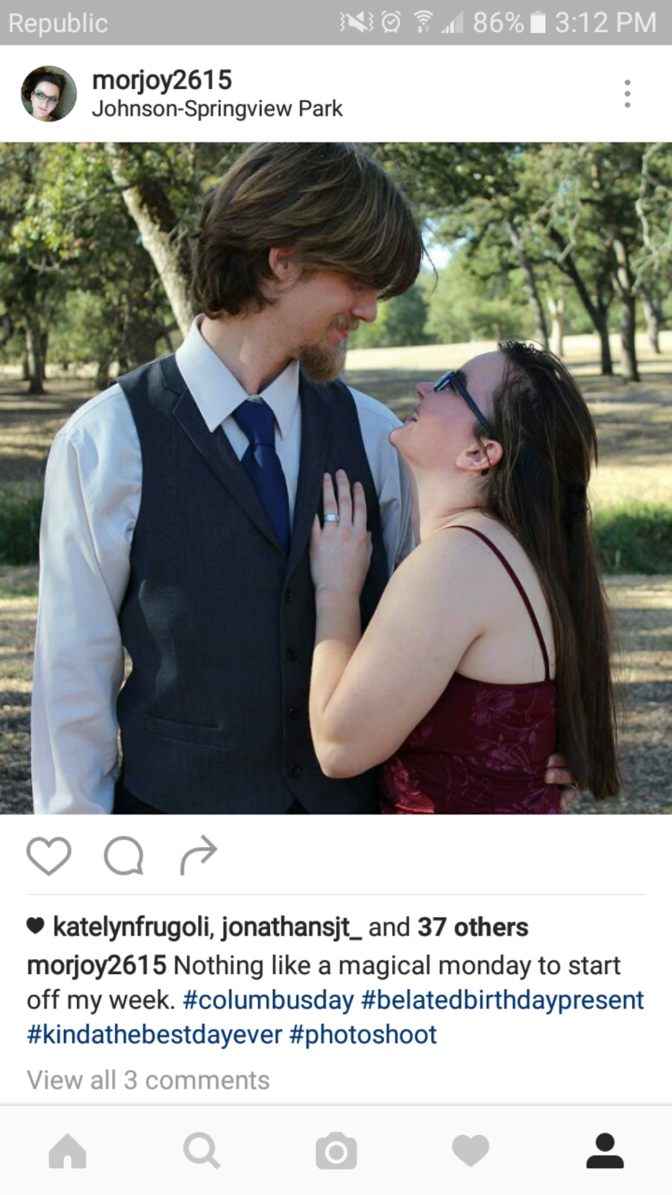 They headed to the park with Jessica Beukelman, a friend of Joy’s who offered to take pictures. For the next hour, Beukelman bossed the couple around the park in order to get the perfect shot. The couple climbed on fences, swings, and trees at her request. Beukelman said the experience was “quite enjoyable.” She “had a very good time,” and “got to meet a cat so that was fun.”