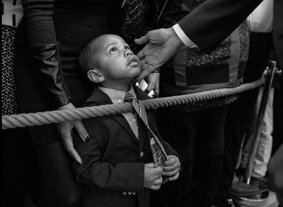 Obama reaching out to a child during a celebration for Black History Month