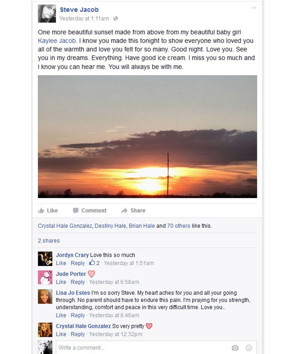 When I go to try to sort out this mess of feelings, there are a few things I can tangibly understand. Firstly, I know that I am angry. This girl was so young, and she had her whole life ahead of her. She was in high school, had a ton of friends, and had a huge family that loved her; this is apparent now more than ever. Hundreds of people have written on her Facebook wall and attended the services held for her. She was so loved.