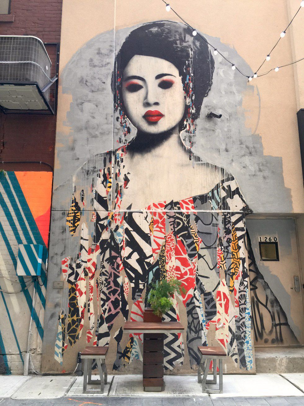 One of the first murals that you see painted on the alley is by Hush, an artist from the UK who formally trained at the Newcastle school of art and design. He mixes the ascetic of traditional art with western modern splashes of bright color and graffiti. The female form is breathtaking while Hush's expressionist components can be seen in the murals gray background.