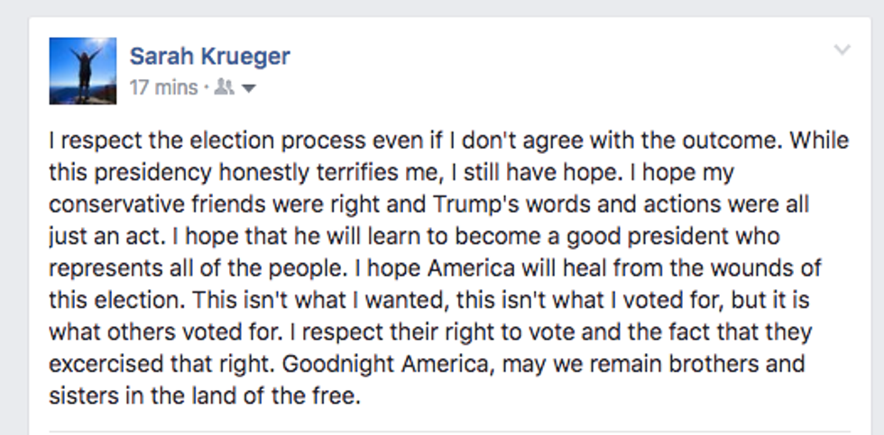 While I am terrified of what could come from this election, it's over. My campaigning is over, my voting is over, it's all over. It's all done. I can hate the outcome but I can't change it. I need to save my fight for things I can control. In January, I'm going to Africa to study abroad for five months. I've joked throughout this election that I might move there permanently if the election doesn't go my way, but barring nuclear explosion I still plan on returning in May and living as an American citizen for the next four years. I plan on living as an American citizen if the election doesn't go my way for the next 8 years...12, 16, 20, whatever. I plan on being happy. I plan on keeping my rights, and fighting against anyone who tries to take them away. I plan on starting a career in social justice and fighting against the very same things that scared me about Trump's campaign. I plan on ensuring that someone out there gets a positive image of an American and a woman by the example I set.