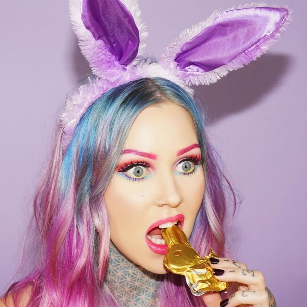 Kristen Leanne is extremely well known for her changing bold hair color. She loves color so much she is the owner of Artic Fox Hair Color. She developed this cruelty-free and vegan semi-permanent hair color to expand the availability and her passion for hair color and helping animals. Her hair colors of choice above involve an ombre color set of blue, purple and pink on medium length waves. I absolutely love how the blue makes her neck tattoo and eyes stand out! When it comes to dying your hair multiple colors, stick to complimenting hues for a flawless look. Plus, a colorful ombre is a great way to make a chic look more fun.