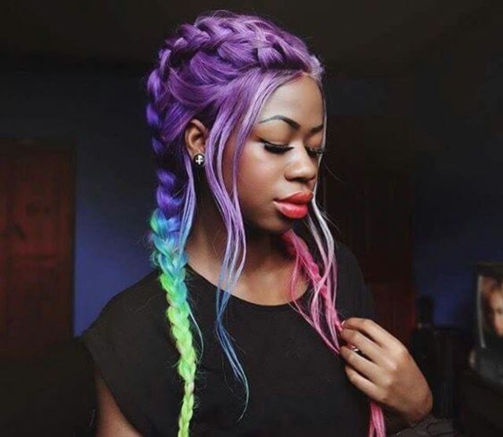 Feeling a bit twisted? I'm obsessed with Queen Cocoa's super colorful braids! Amp up your typical braids with a bit of volume and loose waves for a casual but chic look! Start by adding volume at your roots and begin French braiding your hair back while leaving a few pieces in the front to hang out. Finish the braid until the end and secure with clear hair bands. To thicken the braid, begin to pull apart the braid starting from the bottom and going all the way up to your roots where you started. Finally, finish off your look by wrapping your loose pieces around a curling want and setting the braids with hairspray.