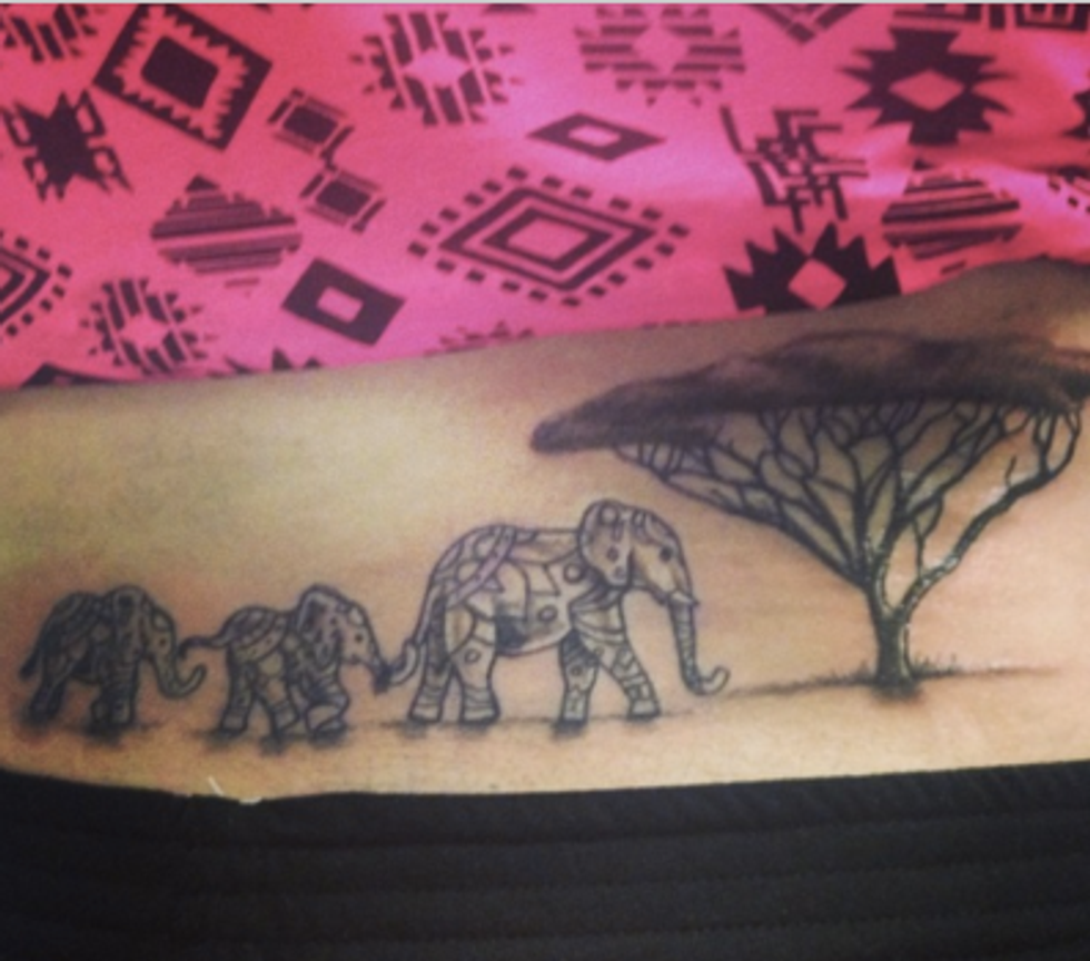 Elephants tend to stay together with their families, which is beautiful in itself. My tattoo has a family of three elephants to show my admiration of elephants and their loyalty to each other. This loyalty to one another shows their intelligence, as well as how loving these animals are.