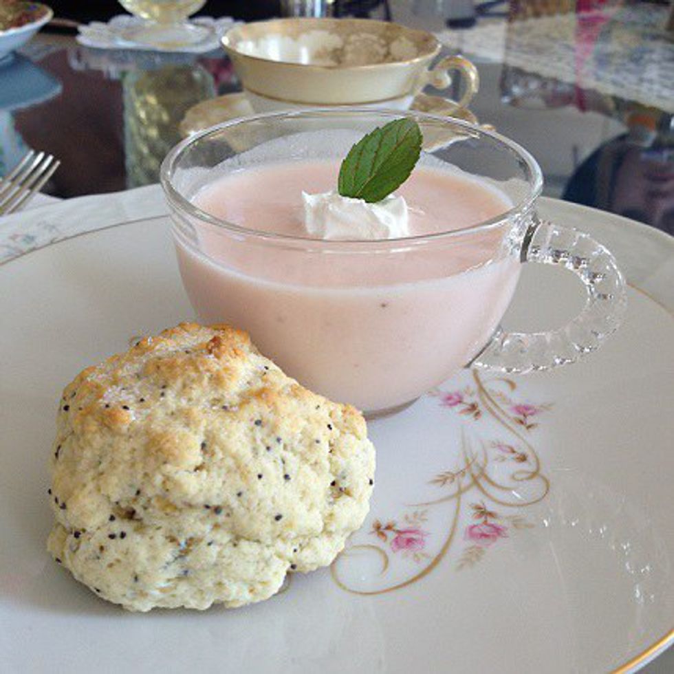 The first course was a lemon poppyseed scone served with devonshire cream and lemon curd, as well as a chilled strawberry soup. The soup was very like a thin strawberry yogurt, and I was into it. The scone was great alone, but along with devonshire cream was amazing.