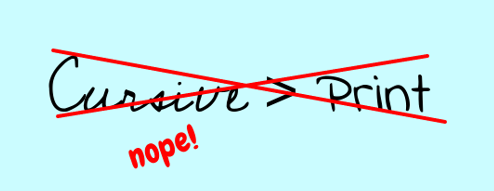 See, you're good for taking notes. Unless someone is truly dedicated to writing in print, cursive is the best option for taking notes in class or meetings. To those who didn't meet you in kindergarten like me, print is quick and easy. Personally, print drags. It wastes time, picking up the pencil half a dozen times or more in a single word. Cursive, you make things easier. Cursive glides from letter to letter with skips only from word to word.