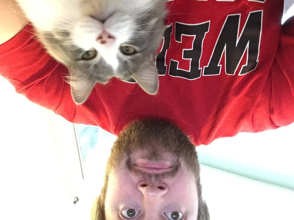 Lucas loves cats. He absolutely adores cats. Through his love for cats, he has helped me to create a club, Help Meow-t, which cares for the feral cats on our college campus. Here is a picture of Lucas and his cat Butterball.