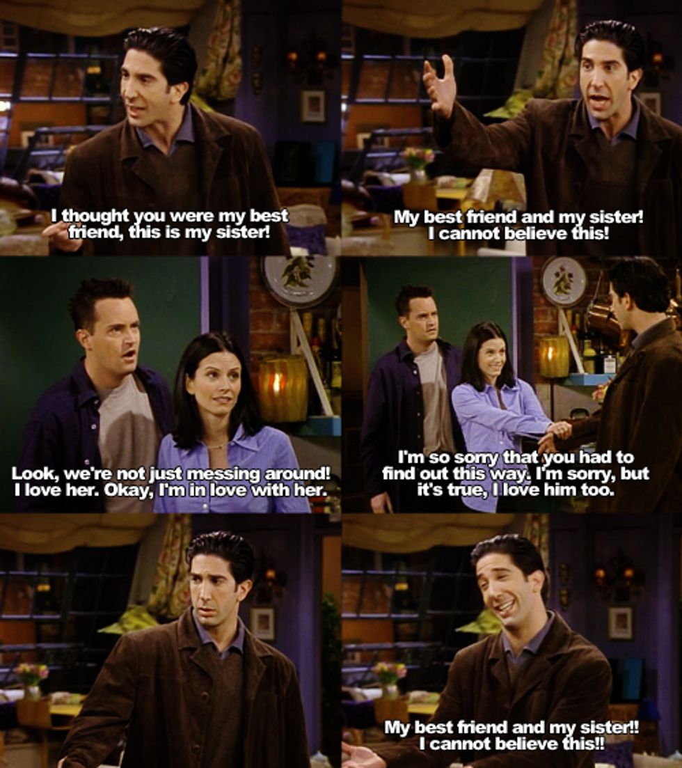 After accidentally overhearing a phone call, Rachel finds out and desperately wants someone else to know. Even when Rachel ended up telling Phoebe and they distracted Ross from finding out until he did. It was a reaction of shock and a little bit of disgust, but Ross quickly realizes how wonderful it is that “his best friend and sister” are together.