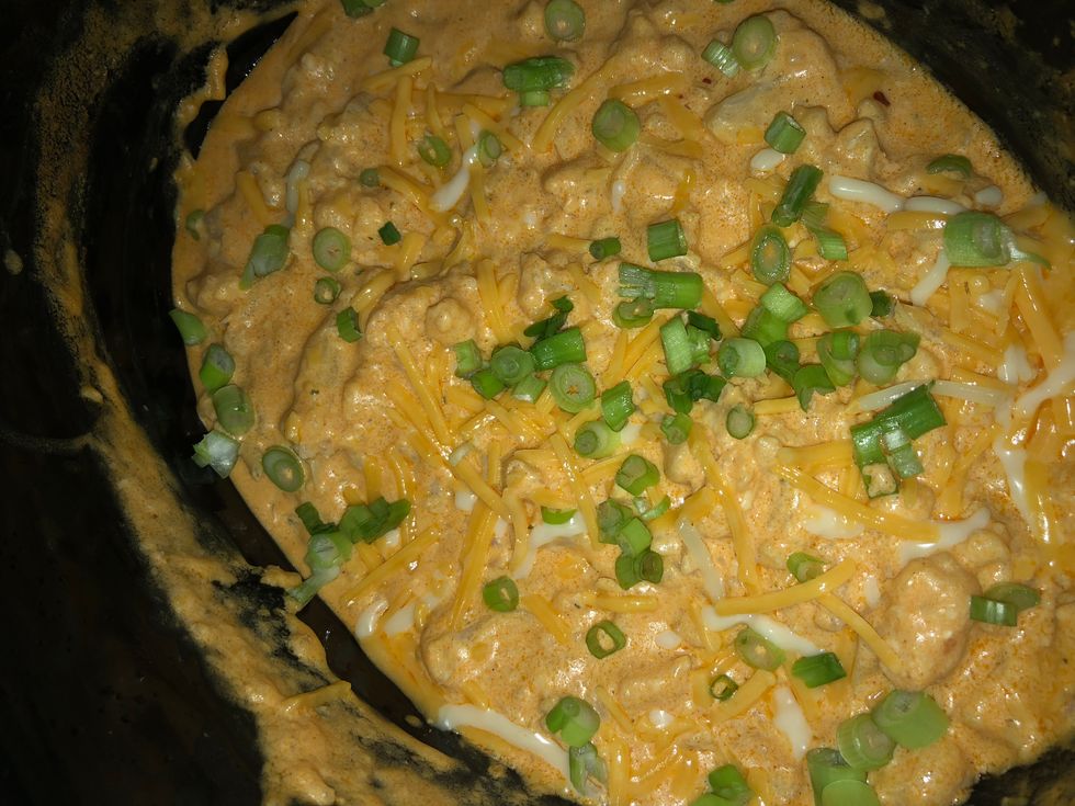 Add 1 bag of frozen cauliflower, 1 cup of cream cheese, 1/2 cup of buffalo/hot sauce, scallions, cheddar cheese, and ranch to the pot. Cook on high for 4 hours, add more scallions and cheese, and enjoy!