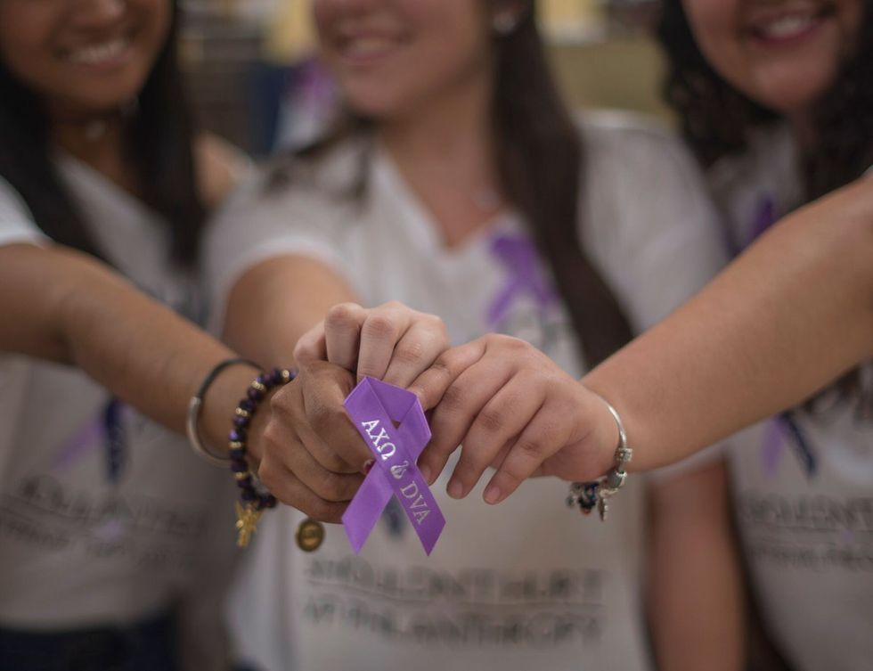 Every day I wear a purple ribbon on my bag to represent the women and men affected by domestic violence. As a member of Alpha Chi Omega, a sorority with a strong philanthropy of Domestic Violence Awareness (DVA), I am dedicated to educating others about DVA and healthy relationships.