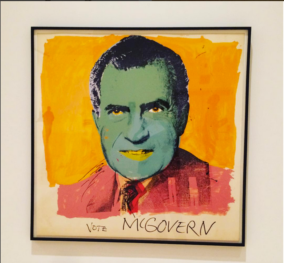 This piece is an icon right here. It was designed by Andy Warhol for George McGovern's 1972 campaign and is basically the antithesis to Obama's "Hope" poster, which might play a smart part as to why Nixon won the election that year and not McGovern. I love the ugly color scheme with the yellow teeth, blue skin and red suit, it all contrasts with one another in a way that makes Nixon look like this evil monster, classic politics really.
