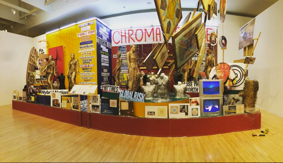 This is one of the strangest (in a good way) art pieces I've ever seen. It's basically a mess of figurines pierced with needles, posters, TV sets, and new headlines all cluttered together. It was made back in 2005, which was during the Iraq War, and I believe it's a critique of how desensitized the public has become to the dark side of humanity because of its over-exposure on mass media. Very bizarre but somehow poignant piece that reflects this cynical time in history.