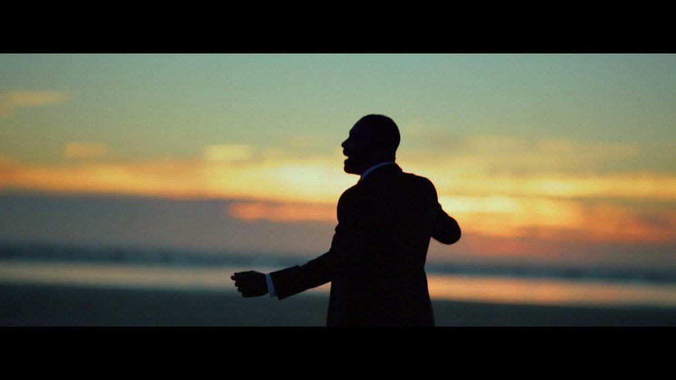 The music video for Mumford and Son's “Lover of the Light” tells a visually enthralling story, which follows a blind man through his morning routine in his country home in England, where he then leaves his disability at the door, runs through the woods, and chases the sunrise. The video opens to a wide shot of the English hillside as an elk approaches, followed by the blind man (played by Idris Elba) waking in his bedroom as light pours in through the window. We then see him venture to his kitchen, where he prepares his breakfast, and where we learn he is blind. Intercuts of the elk appear as the blind man dresses and works his way out the door. Leaving his home, he begins running down the road, through the woods, and eventually winds up at a cliffside, facing the sunrise.
