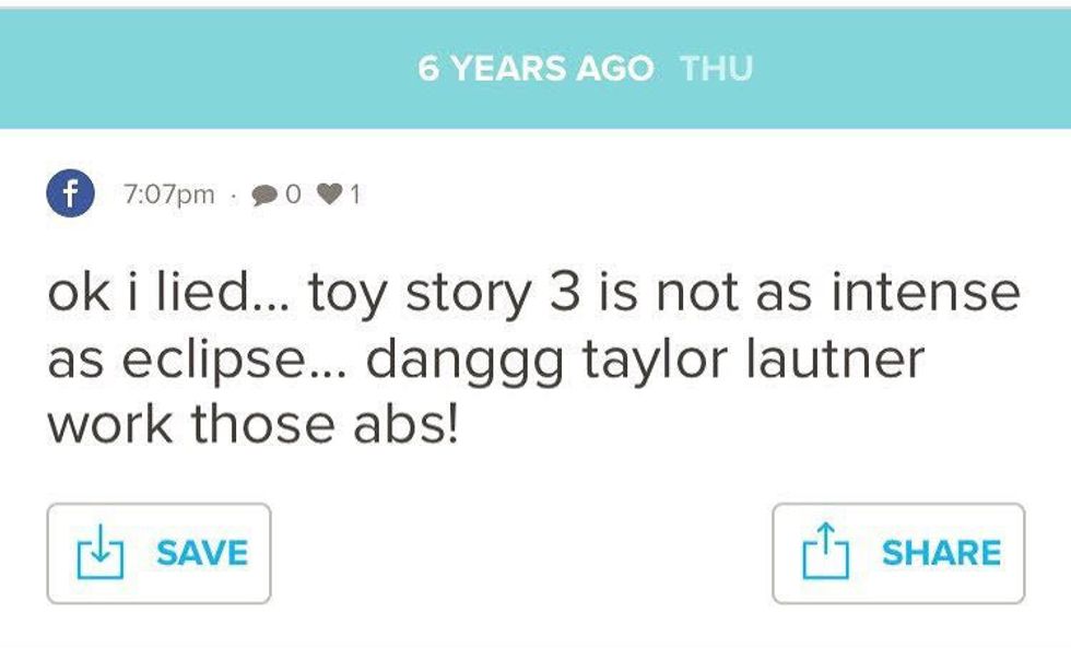 Control yourself please. Is Taylor Lautner still hot 6 years later? Yes. But you don't need to announce it to the world. Who even compares Toy Story 3 to Eclipse? One does not compare Edward Cullen to Buzz Lightyear. Once again, you are a young idiot.