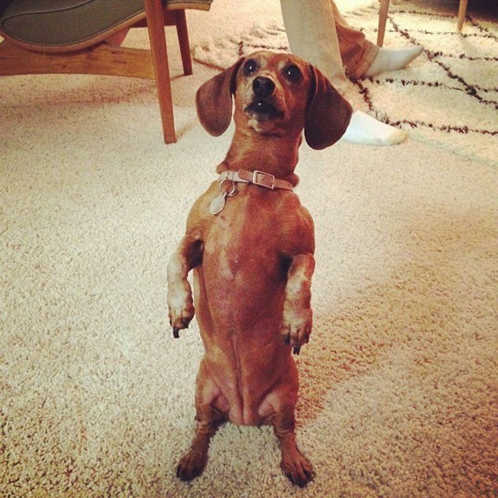 The typical begging pose for any weenie dog, I call it "The Meerkat!"