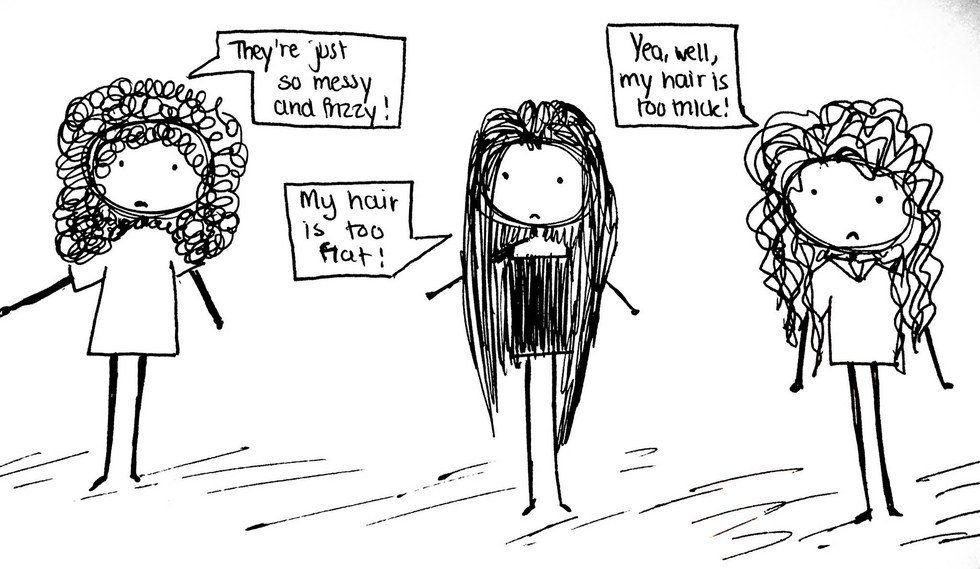 However, I think that for me, especially, it was hard to move past the simple idea of “we always want what we can’t have.” Because this issue is more than just hair. It is a media and an oppressive system failing to encourage a sense of beauty in all forms—particularly when they deviate from the norm. No one on TV had my hair or my skin while I was growing up. Even today, there aren’t many Indian-American females in the American public eye for me to relate to. It has taken me a long time to see the beauty in myself (my hair included) because it took me a long time to understand that I did not have to follow Western standards of beauty. Straightening my hair should have been a choice, not something I felt was an obligatory prerequisite to achieve daily confidence. I am the one that defines beauty for me, and no one else should ever be able to tell me that I don’t fit the standards.