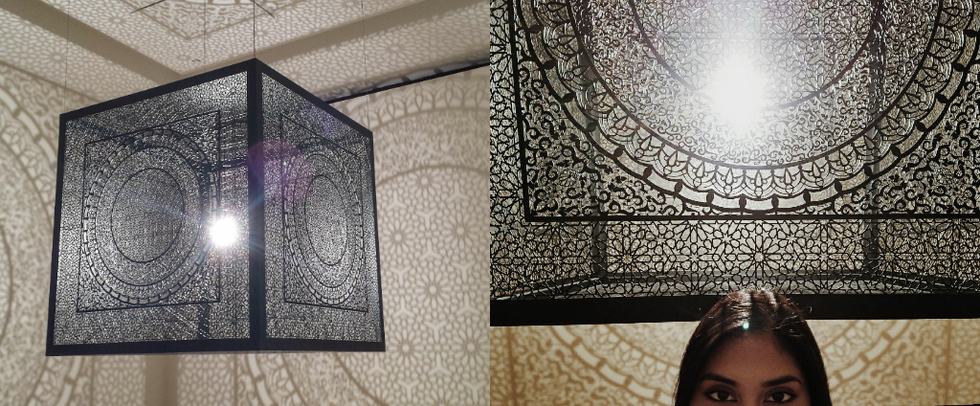 Anila Quayyum Agha's "Crossing Boundaries," is arguably the most 'Instagrammable' feature of the exhibit, but the laser-cut steel and light bulb installation reflects the contradictory qualities inherent in the immigrant experience. The geometric patterns of the installation are meant to mimic those of traditional mosques in Pakistan. Being a woman, Agha was excluded from these while growing up in Pakistan. The space that her art creates, however, is open to people of all creed, color, and belief.