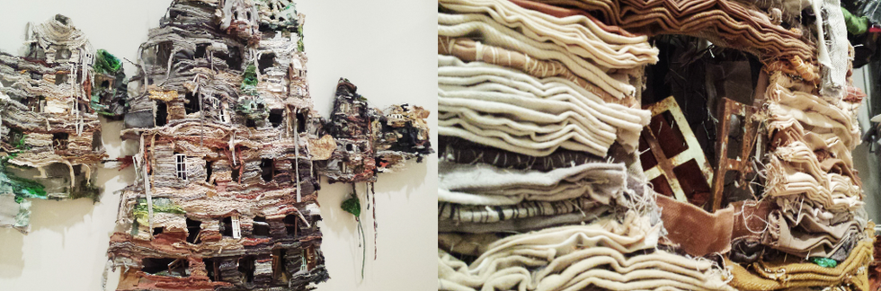 The impact of a place on a person's work is resonant throughout the exhibit. Ruby Chishti's "The Present is a Ruin Without the People," pictured below, represents the spaces that individuals have unwillingly left in times of conflict and war. Chishti attempts to demonstrate the relationship that forms between the personal experiences that immigrants encounter, and the singular narratives that are applied to them as a group.The numerous textiles she uses, like so many of the artworks displayed, prompt questions over the endless, and varied stories hidden in them.