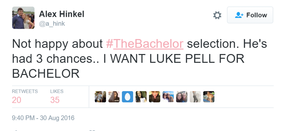 But on August 30, Chris Harrison broke "Bachelor" nation's hearts when he named Nick Viall as the next Bachelor. This will be Nick's fourth try on a "Bachelor" franchise show and if the first three times didn't work, maybe he need to try another process. Don't get me wrong, Nick is a nice guy and I'm still going to watch but I was shocked that Luke wasn't picked, and so was most of Twitter.