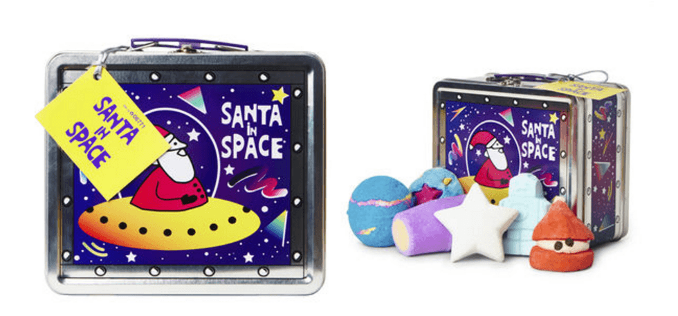 Take your bath out of this world with Santa In Space! With four bat bombs and two bubble bars, you'll be sure to be blasted into the starts with Santa in Space. Stardust, Northern Lights, Intergalactic, and Ickle Baby Bot Bath Bombs will turn your bath into an astronomical dream, and Peeping Santa and Big Bang Bubble Bars will create mountains of strawberry-lemony scented bubbles. Enjoy the ride on this rocketship!