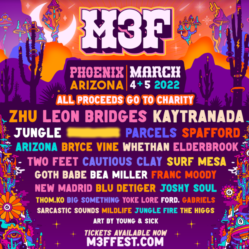 M3F is a festival located in Phoenix, Arizona on March 4th and 5th. What makes this festival unique is that all proceeds go to charity. There are three Tiers of tickets. You can buy a General Admission, VIP, or VIP+. New to this year's festival is now a Party Porch ticket. This ticket allows you access to all three stages with the best view. Not only that, but you also are granted credit for free drinks, exclusive activations, and more! Tickets are offered for the entire weekend or specific days depending on your preference. Since 2004, this amazing festival has raised up to 3.2 million for charity. This festival is not limited on music either. There is also yoga, a drum circle, drink stations, food trucks, and even a kid zone if you're worried about having to find a babysitter. This year's festival has the following headliners: Zhu, Leon Bridges, and Kaytranada. This year's festival is going to be unreal, hope to see you there!