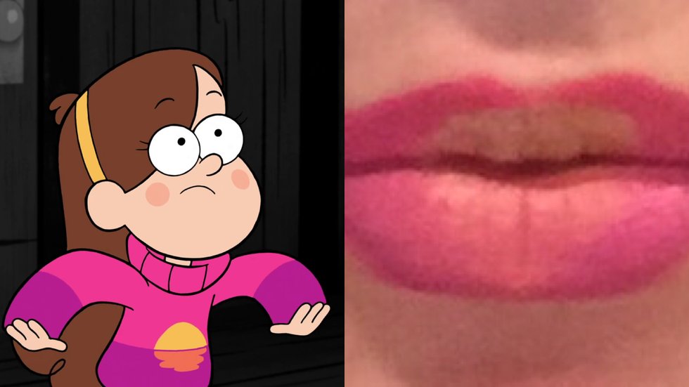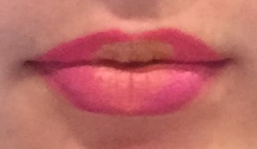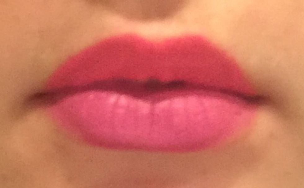 After lining your lips with a nude pencil, apply a bright pink shade to the upper lip and a similar pink/purple shade to the bottom. Try not to mix them too much - if you're using liquid lipstick, wait for the upper lip to dry before doing the bottom lip. If you're using regular solid lipstick, try setting it with translucent powder before going to the next color.