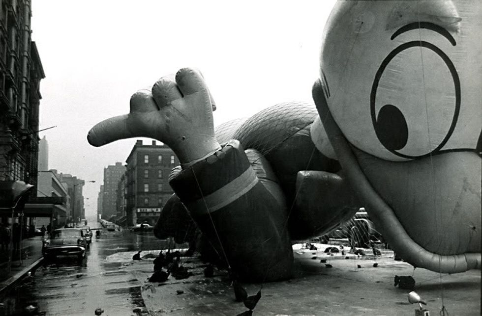 Fast forward to 1962, in the image above, the Donald Duck balloon tipped over when his hat filled with water due to the rain. This was also the first year that sports champions were featured in the parade, including Willie Mays, Jack Dempsey, and Otto Graham.