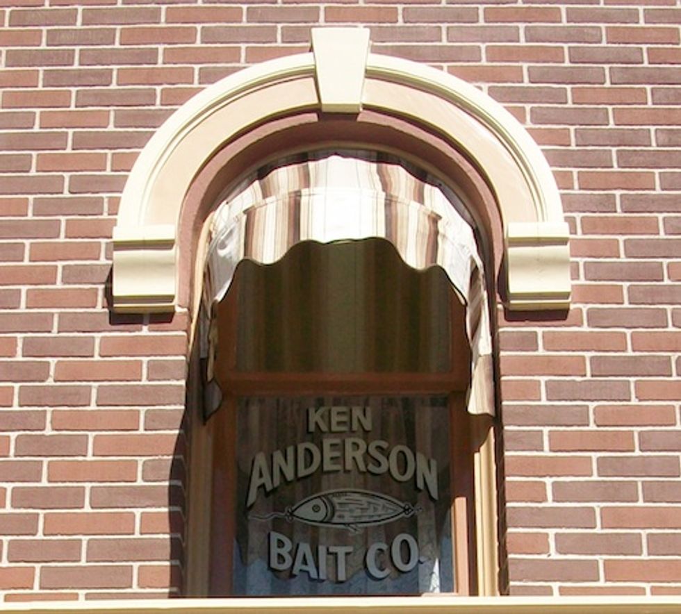 Not as easy to read, am I right? This window is more simplistic in its design. Now, Anderson was actually a really influential Disney art director who worked on movies such as "The Jungle Book," "Snow White and the Seven Dwarfs," and a few others. He specialized in architecture, and played a part in the developing and designing of the park itself! This is all great, and he became a Disney Legend for it, but you might be wondering...what does this have to do with "Bait Co.?" Well, Anderson was actually really into fly-fishing, which makes the window a humorous one, as fly-fishing does not make use of bait at all! Oh, Disney and their painstaking attention to detail! Gotta love it.
