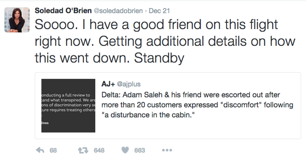 Here are examples of professional media that promoted this fake piece of media. CNN contributor, Soledad O'Brien claimed that she had a friend on the flight that claimed to support Saleh's account. She tweeted a pic of her friend's statement here: