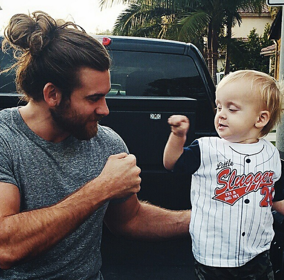 Look at how O'Hurn is sharing the love for the man bun with future generations. Let us all fist pump to the greatest hairstyle to reach society.