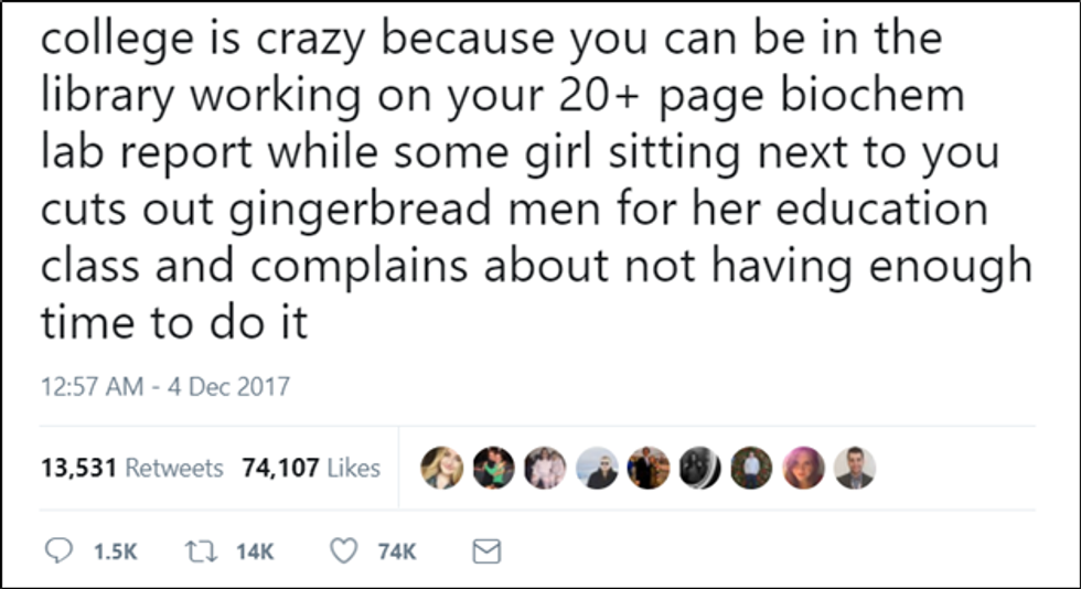 Every college major leads to a career that will equally contribute to society. Think about it – the girl who tweeted this, a biochemistry major, may ultimately become a doctor who could one day save a life. While the girl she tweeted about, an education major, may become a teacher who will educate our future generations so they too, have the power to choose what they wish to do with their knowledge. All careers complement each other and contribute to the functioning of the community as a whole.