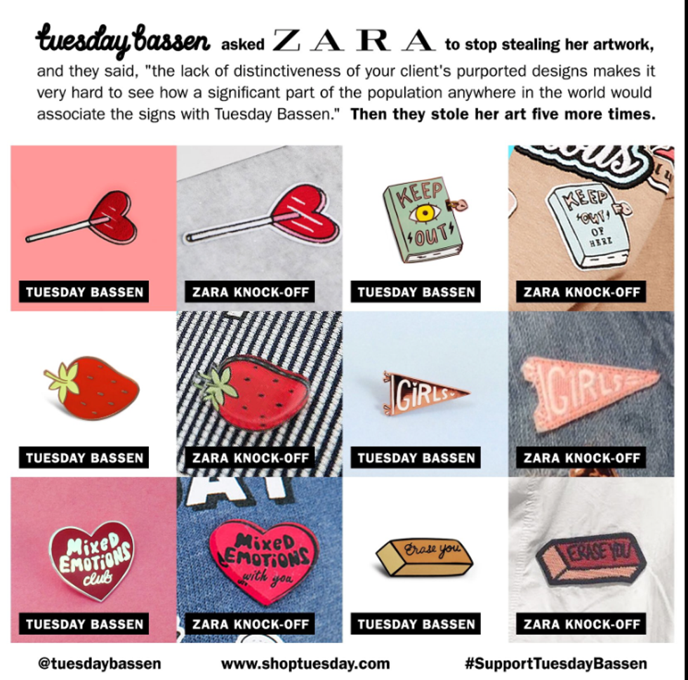 The sad part is that these indie artists and small companies don’t have the funds necessary to take on these giant corporations. To companies like Zara, stealing from artists isn't a big deal because they know nothing can be done. There’s clearly no ethical code that matters to them either, because most people don’t steal other people's work. The major companies are not following the rules that the little companies are following, and it’s creating situations like this.