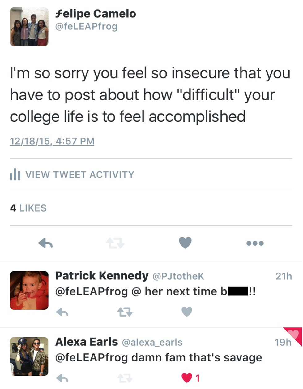 Here is a Tweet expressing my thoughts on those who brag about their major on Facebook along with agreement from friends