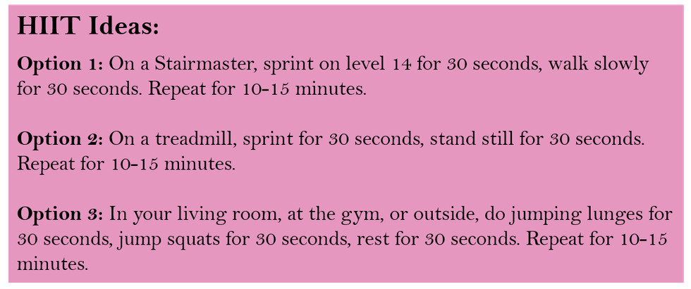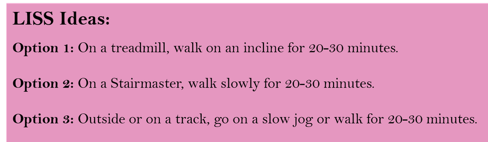 Rather than spending hours on the treadmill at a time, I am adding in 2 15-minute HIIT sessions per week and 1 30-minute LISS session each week. Let me break this down for you.