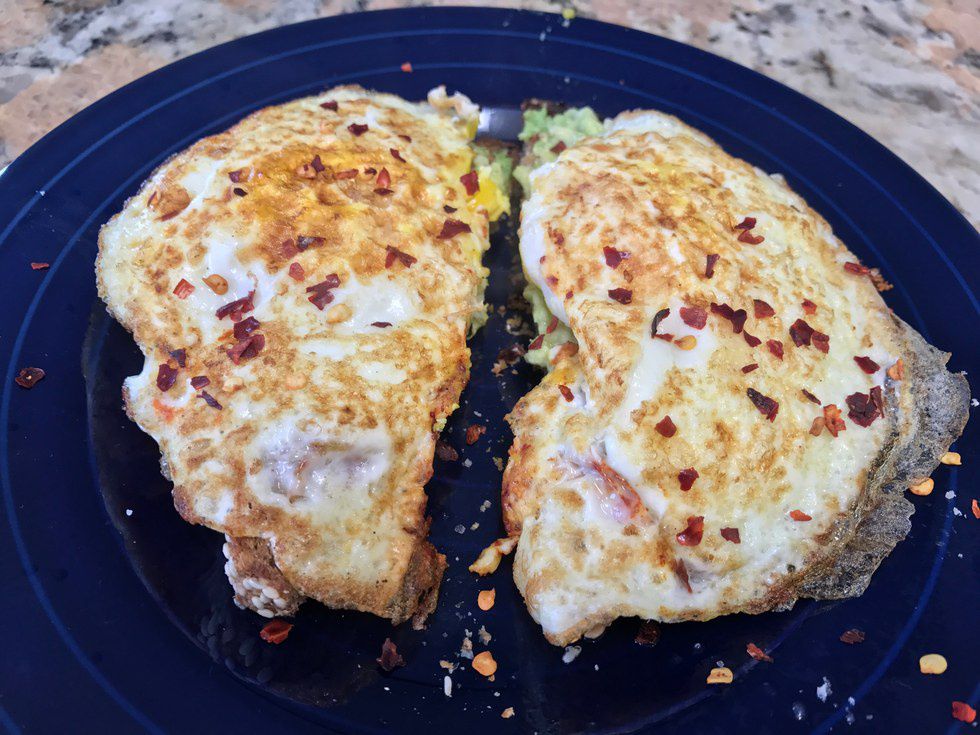 Stick the bread in the toaster. Heat a pan on medium heat. Coat the pan with cooking spray. Fry eggs 1 minute on each side, for a nice and runny yolk. Pull the bread out of the toaster. Use a fork to mash the avocado onto the toast. Squeeze the lemon over the toast. Sprinkle the chili flakes and salt and pepper to taste. Cut toast in half. When the eggs are ready, place one on each half. And lastly. ENJOY.