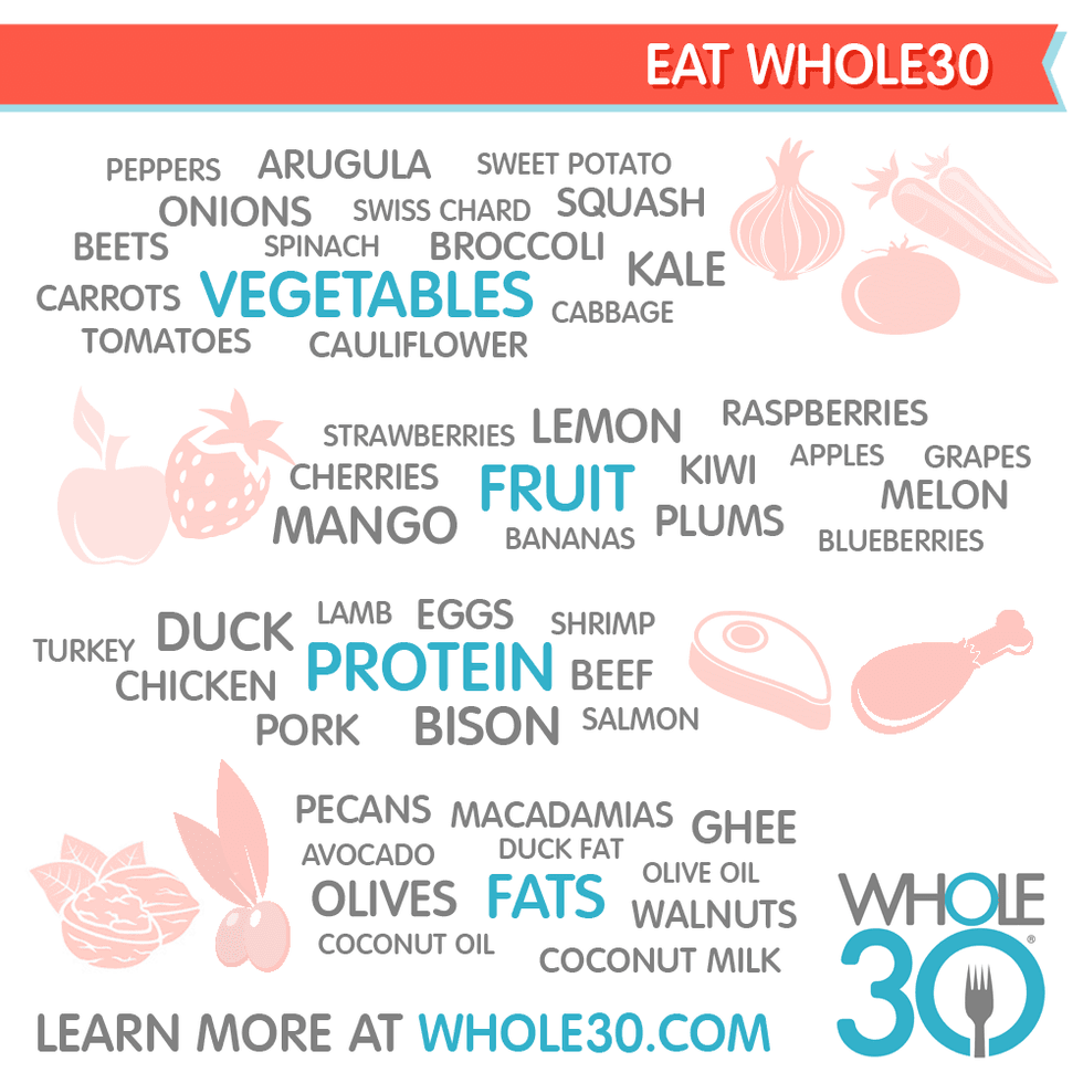 Whole 30The third, Whole 30, consists of foods you'd typically find at a Whole Foods Market or similar health store. This option cuts out any inflammatory, hormone-imbalancing, and "fake" healthy foods. This includes eliminating dairy, legumes, grains, alcohol, added sugars, grains, foods with additives, and processed options. The goal is as close to fresh and natural as possible.