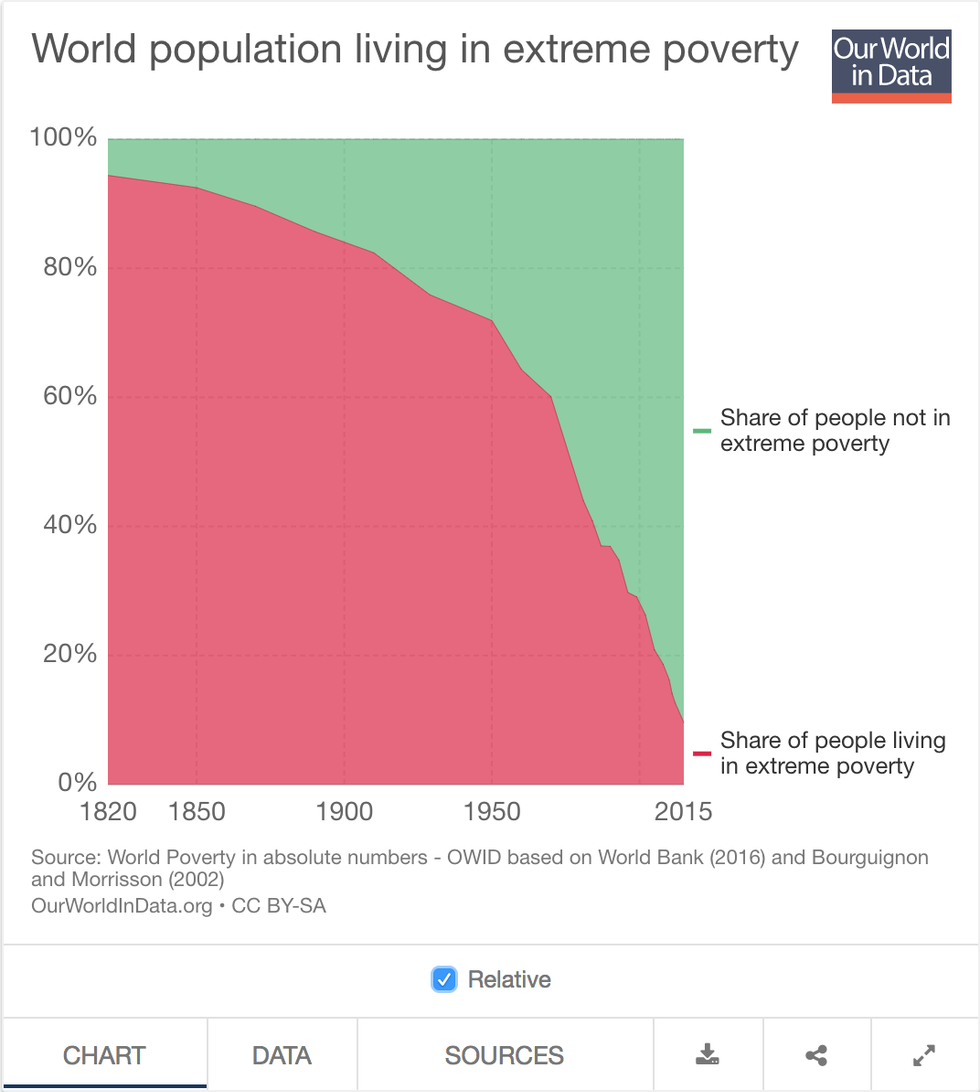 It shows that a smaller percentage of the world's population is living in poverty than at any time in the past 200 years. Check out the link to look at the numbers for specific years.