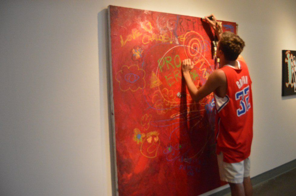 Within an hour of the exhibit being opened, the formerly solid red canvas became covered in a multitude of colors and designs from not only students attending the gallery, but also from other faculty artists there to showcase their work, as well as children accompanying their parents, giving many different views into different perspectives and age ranges adding their own piece of the art. By the end of the first night of the gallery being open, the oil pens were worn down from the eager expressiveness of the gallery viewers, and the piece itself was covered from top to bottom in different strokes, pictures, and words giving light to the different feelings in which every person adding on was feeling in that moment. Toth plans to replace the pens potentially daily and watch the evolution of what was his blank canvas as the days go on for the gallery.