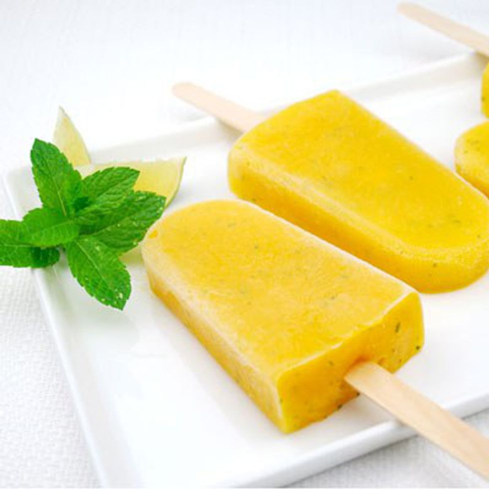 Chop the mint leaves until they are very small. Combine all ingredients into a blender. Blend until the ingredients are incorporated. Pour into popsicle molds and freeze for 18-24 hours.