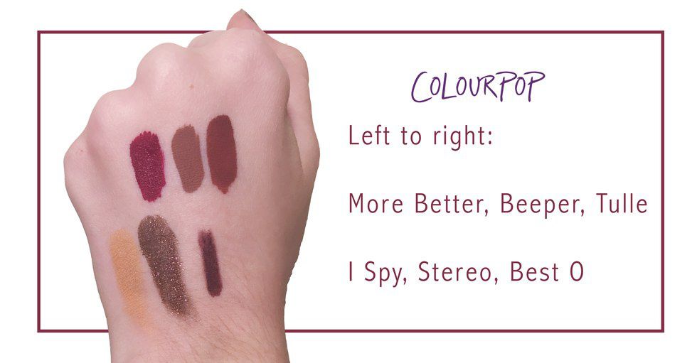 Colourpop cosmetics is based out of California, and all of their products are cruelty-free and made in the U.S.A. Most of them are even vegan (they have a list of the specific shades that are not vegan on their website). On top of all of this, the brand is extremely affordable, with product prices ranging from $5 to $8. I have ordered from Colourpop in the past, but they have since come out with some new products I wanted to try, so I ordered a few to try. Swatches of all of the products I purchased are below: