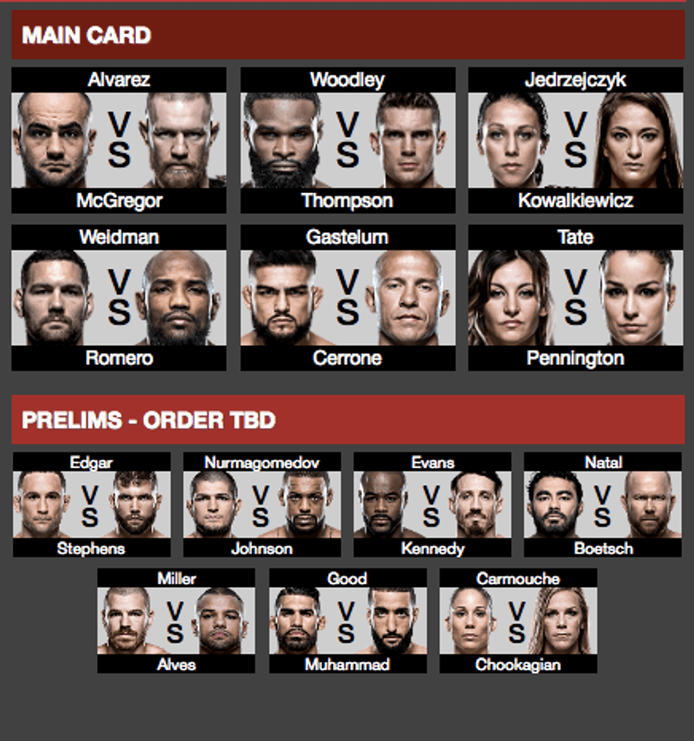 Who else but the Notorious Conor McGregor will be headlining? Of course they go for what will get most pay per views because the mouthy McGregor clearly sells with his skill and his attitude. I actually am pretty excited to see this bout and can't wait to see how Alvarez and McGregor go head to head. We have some upsets when it comes to other fighters this past month Jose Aldo, former champ who fought Notorious at 196, is talking about leaving the UFC due to the attention directed at McGregor. It's too early to say if this is for sure happening, but the way Aldo is talking makes it seem like a pretty big possibility.