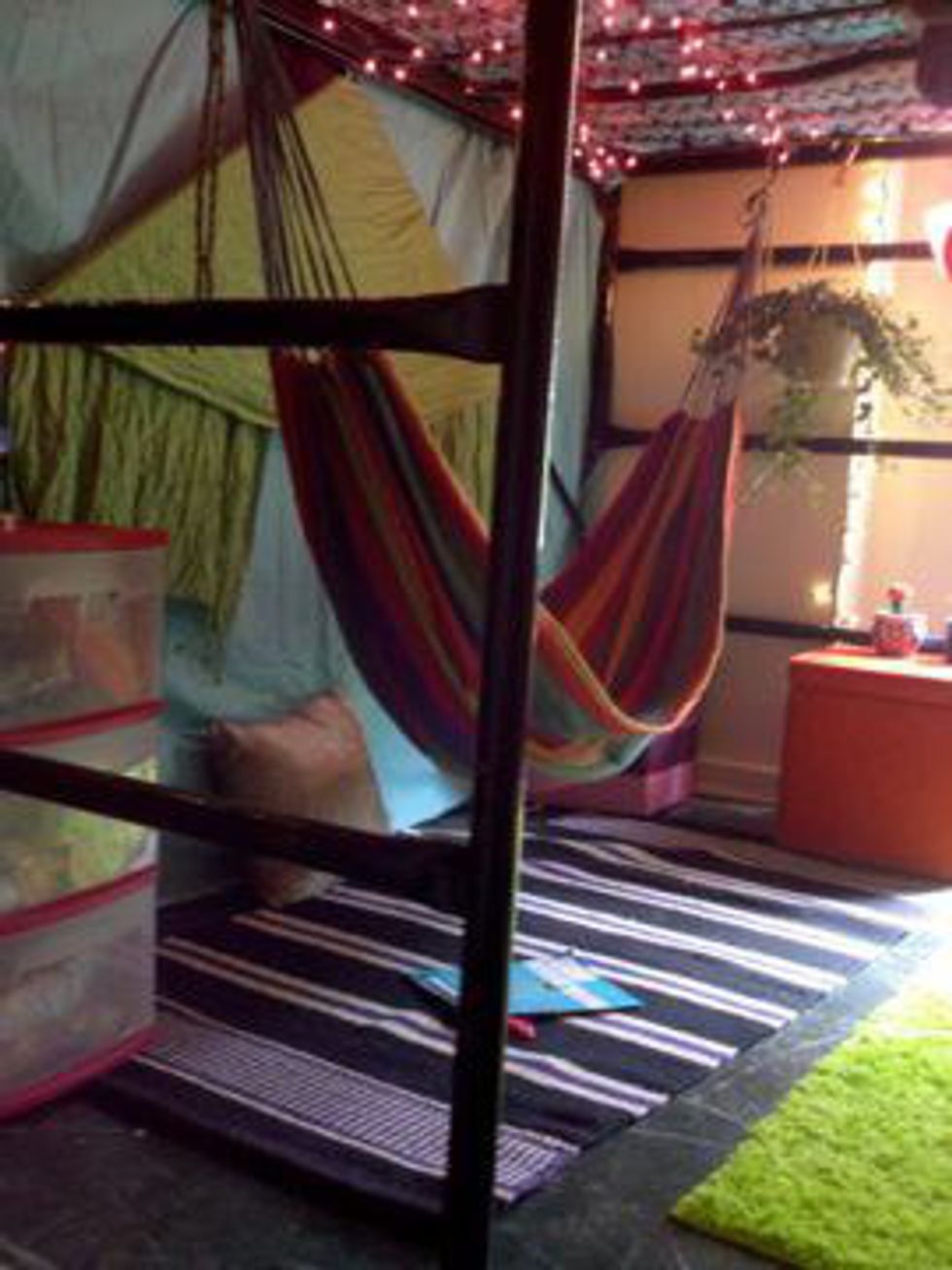 The ultimate dorm room accessory which I love love love is my hammock! My Eno hammock and my roommate’s Himal hammock are the best parts of our dorm room. Both are great hammocks. If you are willing to spend a little bit extra, the Eno hammock is fantastic, but the Himal hammock is much cheaper and fits perfectly under a dorm bed. My roommate and I both lofted our bed which allowed us to not only have a “living space” down below, but a place to escape up top to sleep. We put the hammocks under our beds which has been awesome! It provides us with more space when having people over as well as space. With this arrangement our room can be messy, but still look clean because of the amount of personal and hidden space that we have.