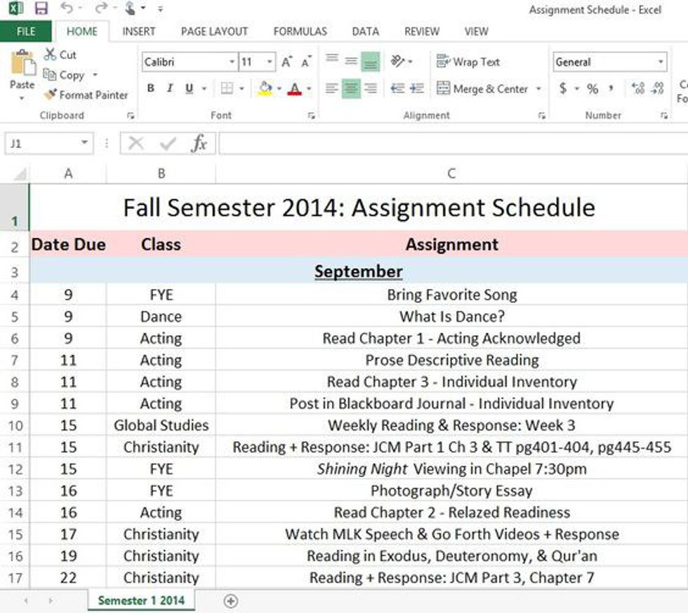 This is really helpful. I made one this quarter, and it has helped me remember when I have assignments due or appointments I need to attend. It is so much easier to look at rather than constantly shuffling through all of your syllabi. Every time I turn in an assignment, I highlight what has been completed. The more color I see, the more I have finished. I become more organized, and have a little fun doing it. (The act of checking something off of your list is surprisingly satisfying.)