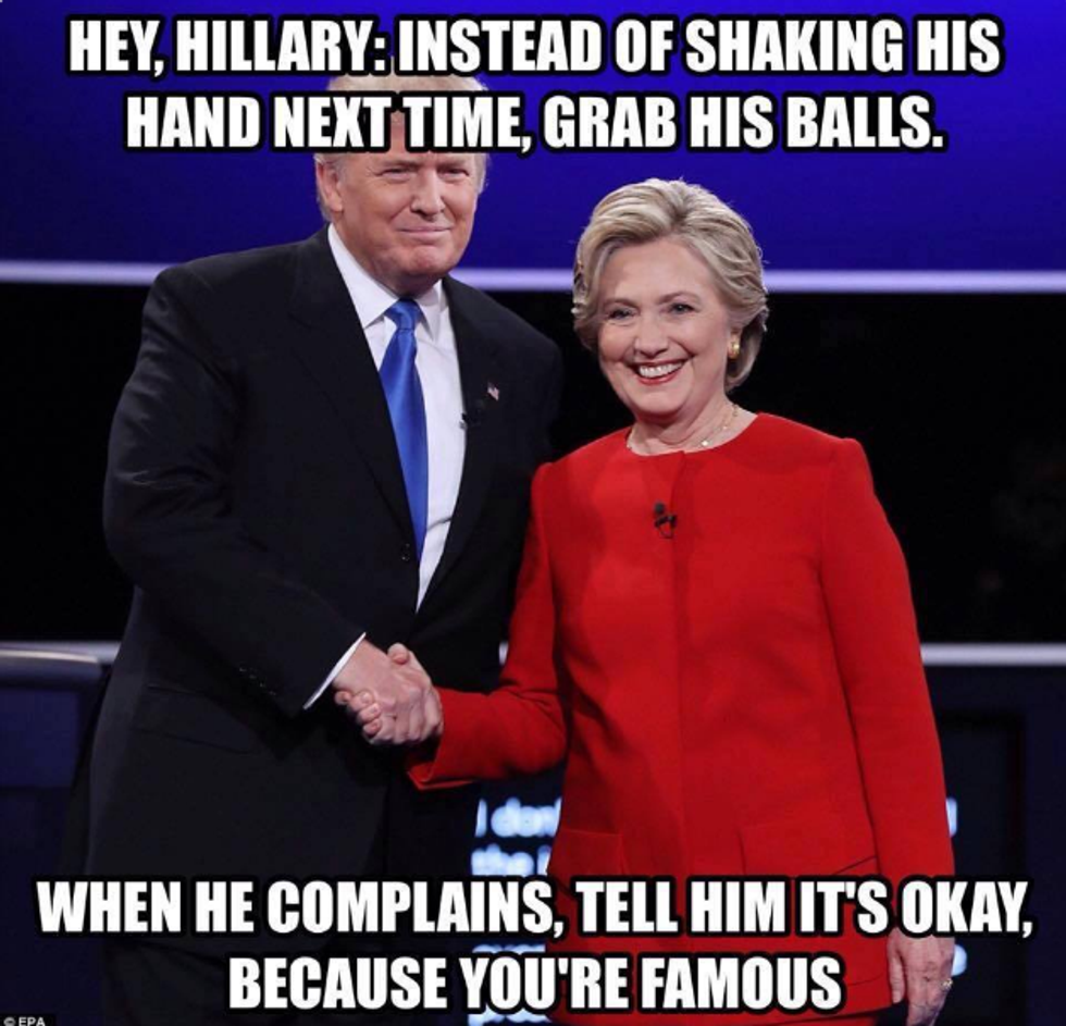 So for anyone who lives under a rock, here's an update. The trending memes are all about the election. There's a lot of talk about Trump's comment about grabbing women's genitals. People are speaking out and bringing attention to it being sexual assault. Honestly, yeah, it's pretty screwed up and calling it sexual assault isn't a stretch. How people are still going to vote for this dude is beyond me -- but to each his own. Exercise your rights, whatever. Bashing Trump for promoting rape culture isn't really what I'm here for. Instead, I'm going to talk about this BS circulating the Internet: