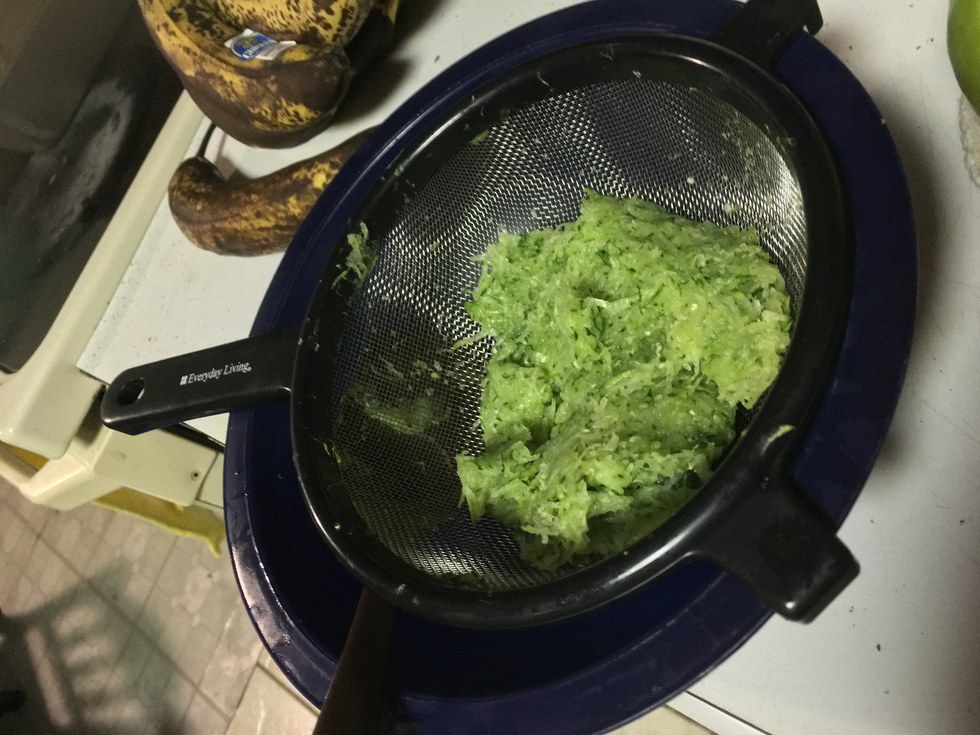 The first, hardest, and most singularly time consuming part of making delicious Banana-Zucchini-Walnut Bread is shredding the zucchini. So to make it easier on myself, and to make sure that the bread doesn’t turn out too soggy, I grate my zucchini the night before. My garden gave me some ridiculously large zucchinis this year, so for me it takes less than one huge zucchini to do the trick. For normal-sized, store bought zucchinis you’ll probably need to use two. After grating the zucchini, I take a small mesh colander and let the grated zucchini sit in it over night. Every once in a while, I’ll go to the fridge and push the zucchini down to squeeze more water out of it, but that could just be my fascination with having a perfect outcome!