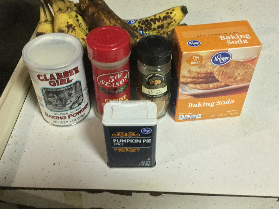 Ingredients: (makes two loafs) 4 eggs 2 cups sugar (or 5 teaspoons stevia) 1 cup vegetable oil 2 medium overripe bananas, mashed (about 1 cup) 3 cups flour 1 ½ teaspoons baking powder 1 ½ teaspoons baking soda 3 teaspoons ground cinnamon 1 teaspoon salt 4 teaspoons pumpkin pie spice 4 teaspoons nutmeg 1 ½ cups shredded unpeeled zucchini 1 cup chopped walnuts