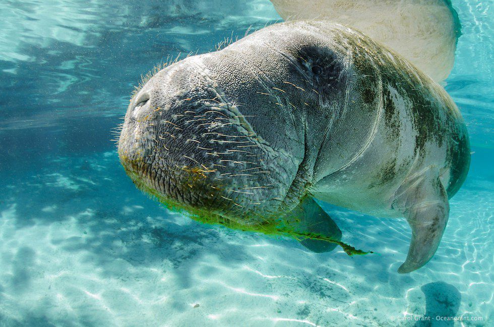 What I find fascinating about their anatomy is that they do not have a neck, so they have to turn their entire bodies in the direction they want to look\go in. The gestation period for a West Indian manatee usually lasts 12-14 months and they can only produce one calf per birth, thus making the reproduction process slow. Although they have rather large physiques, they're actually the most non-threatening and docile mammal you could encounter. In other words, they are "gentle giants", and in my opinion, they are absolutely adorable. How can you not like that mushy face?